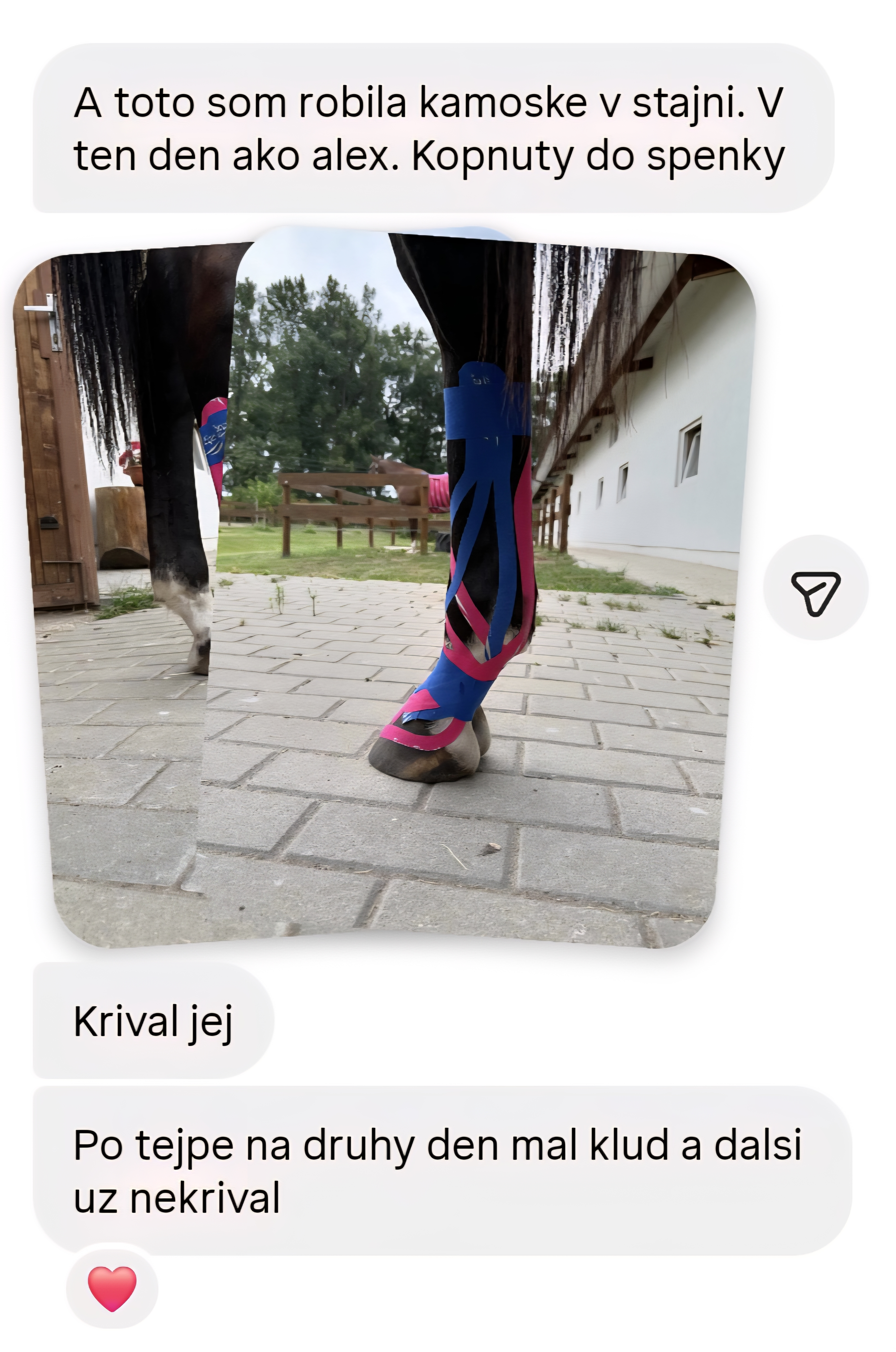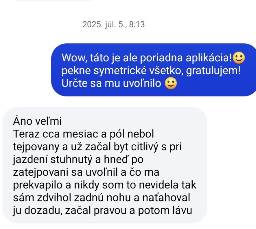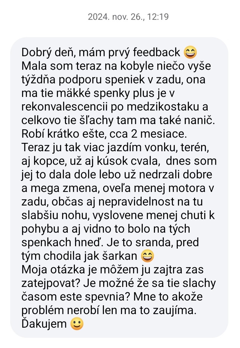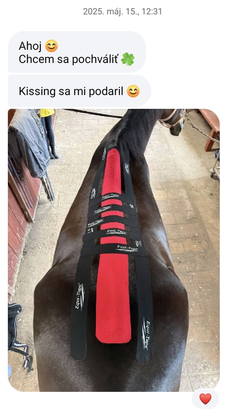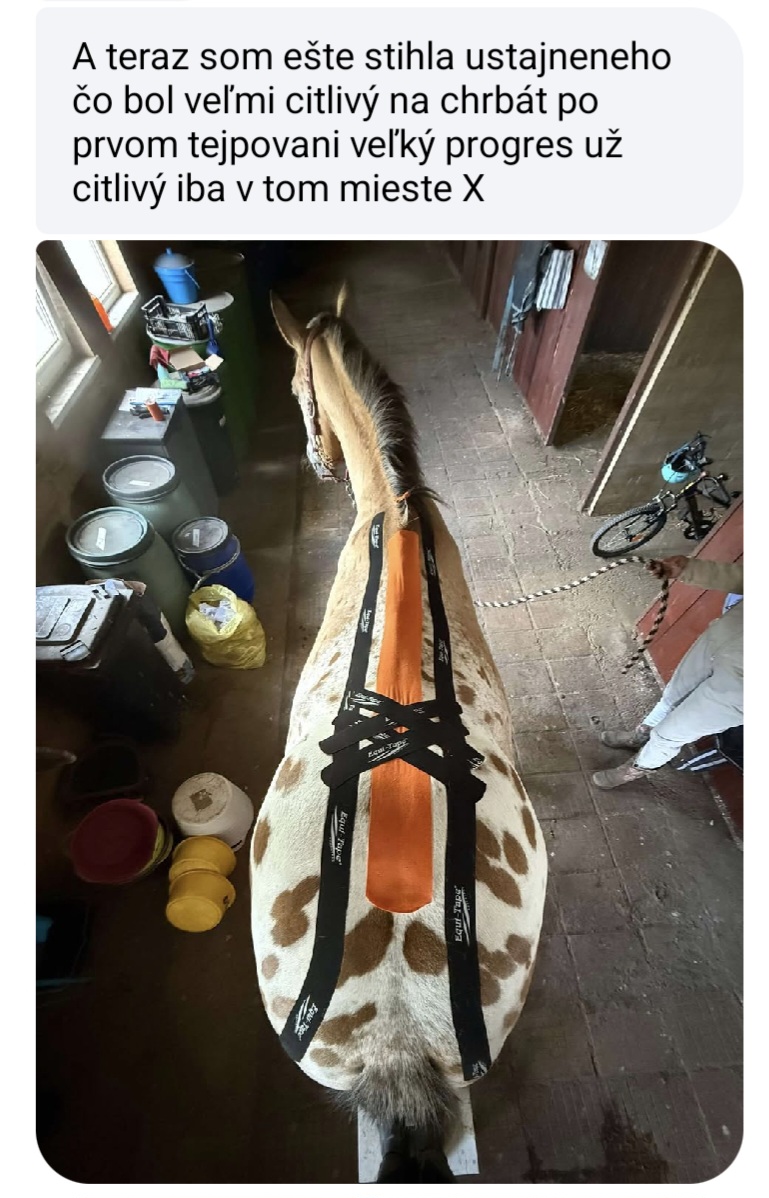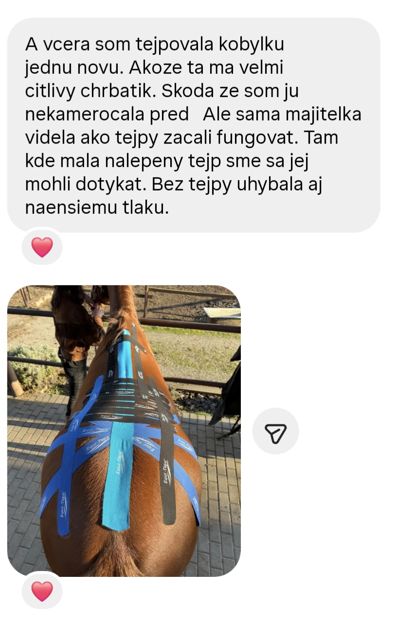 Karolina R.: „Ahoj Zuzka! Ja sa musím takto v hlasovke podeliť s mojou skúsenosťou, lebo už som bola strašne zúfalá – mám takého 26-ročného dedula koňa. Kríval, bola aj veterinárka, nevedeli sme proste že čo, povedala mi, že je to prevdepodobne taká starecká artróza. Ja som ho teda natejpovala. Urobila som mu len podporu sponkového kĺbu a akože... po 3 dňoch od natejpovania mi tu teraz cvála po pasienku! Normálne je mi do plaču, lebo som sa strašne bála! A jemu to fakt pomohlo! Tie tejpy sú normálne Boží dar!“