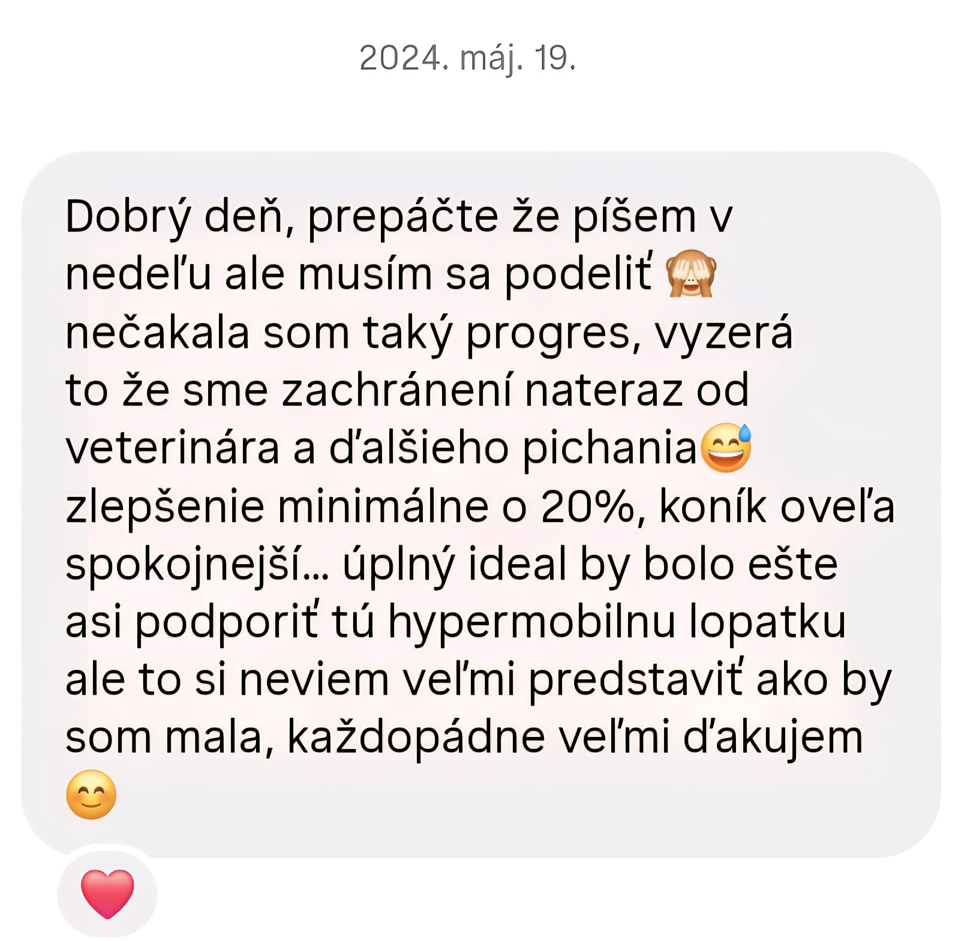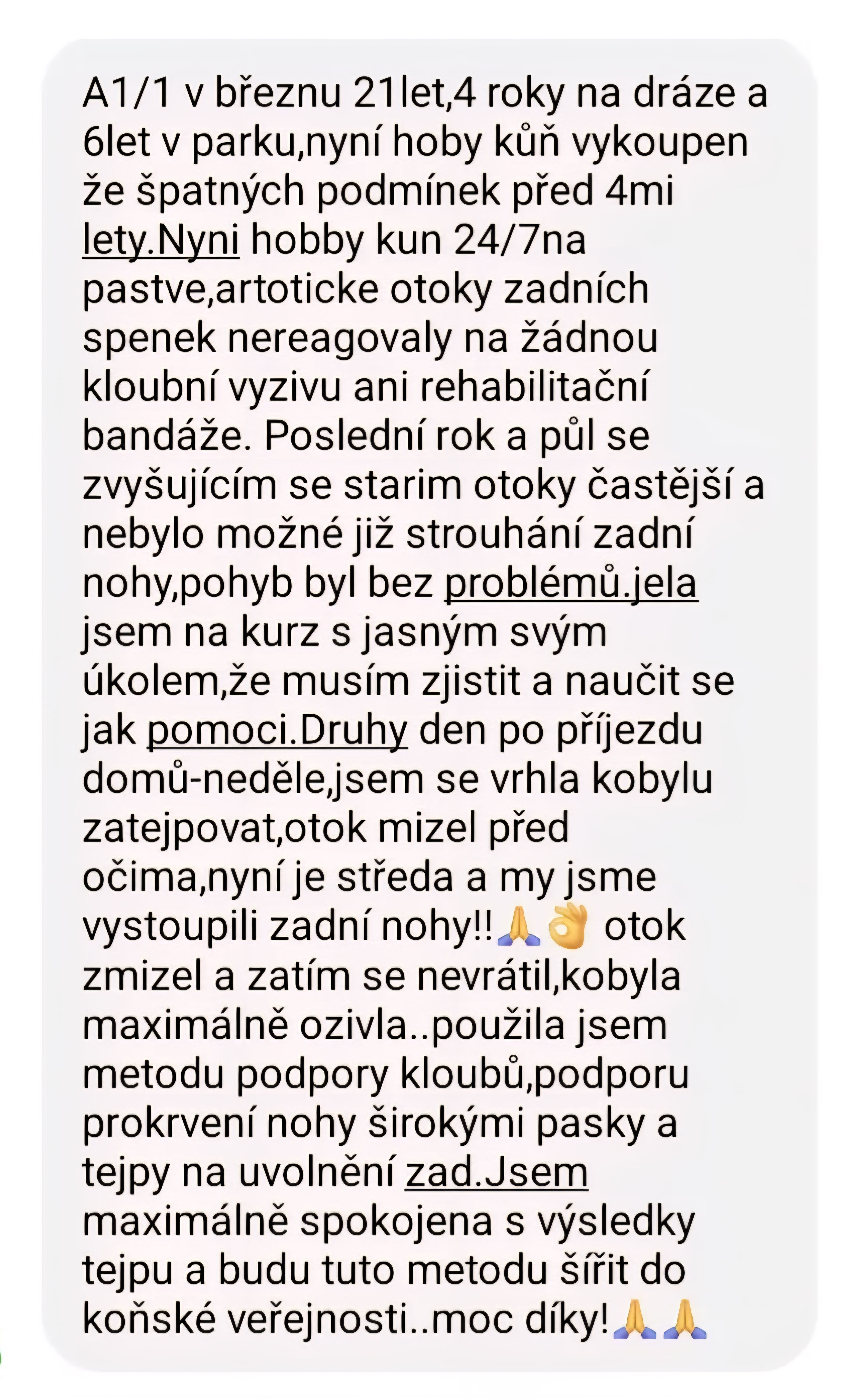 Vlada M.K.: „Chcela by som Vájm veľmi-veľmi pekne poďakovať za to ako ste mi odporučili otejpovať tú šľachu natiahnutú. Skutočne, v pondelok večer som jej to otejpovala, včera som ju nechala v kľude, dnes som už skúšala krok, klus, šľacha úplne odpuchla, bez problémov naklusala...tak naozaj som šťastná že som bola na Vašom kurze a že ste mi tak na diaľku poradili, lebo skutočne sa jej hneď na druhý deň uľavilo!“